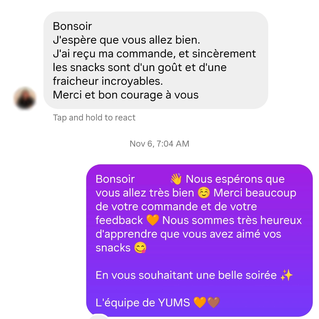 Découvrez les retours de la communauté sur YUMS, les snacks que nos clients ont essayé et ce qu’ils ont aimé.